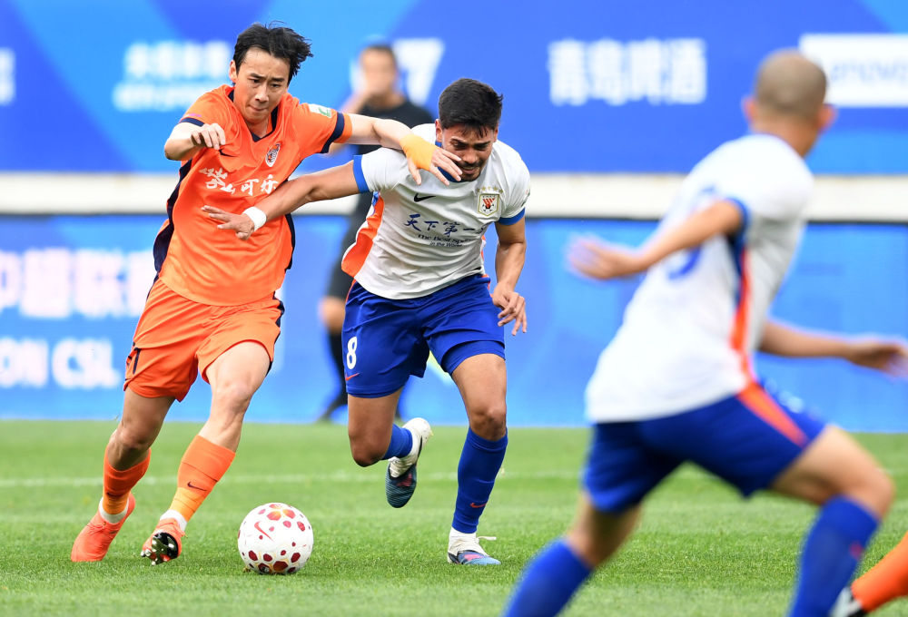 Vào ngày 26 tháng 4, cầu thủ Luo Senwen của Qingdao Manatee đã đánh nhau với cầu thủ Madruga của đội Shandong Taishan trong trận đấu. Luo Senwen lúc đó ở bên trái. Bức ảnh này được chụp bởi phóng viên Tân Hoa Xã Li Ziheng.